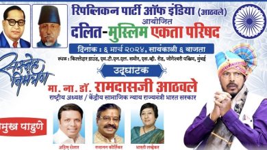 भव्य दलित मूस्लीम एकता परीषदेला मोठ्या संख्येत उपस्थित रहावेमा.सिद्धार्थजी कासारे -अध्यक्ष मूंबई प्रदेश रिपब्लिकन पक्षाच्या वतीने येत्या बुधवार दि.6 मार्च…