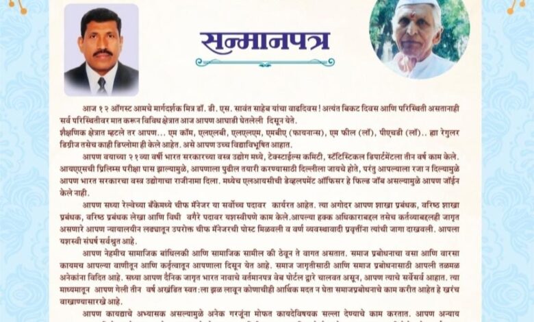सम्मान पत्र किसी को युं ही नही मिलता जी। जब इंसान अपनी सच्ची लगन और कडी मेहनत से उचे से उचे मकाम पर पहुंच जाता है तब हर कामयाबी उसके कदम चुमने लगती है। यह कामयाबी का सिद्धांत है। इस सम्मान पत्र से आप सम्मानीत नही हुवे, बल्कि उस सम्मान पत्र का सम्मान बढ गया है। उसकी उंचाई और बढ गयी। और यह तब होता है, जब इंसान कडा संघर्ष करके, अपने जीवन में कठीण वक्त को मात देता है। यह तभी होता है जब इंसान अपना ध्येय/उद्देश ऑंखो के सामने रख कर बुद्ध और डॉ. बाबासाहब जी के विचारों पर मार्गक्रमणा करता है। आपकी इस कामयाबी और सम्मान प्राप्त होने पर हमारे सारे सवाई परिवार की ओर से ढेर सारी बधाई देते है। भविष्य में आप कामयाबी की बुलंदी छुए ऐसी हम मनोकामना करते है, प्रकृती के सामने। खैर!