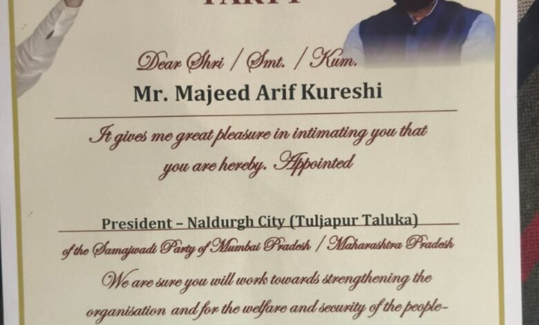 माजीद कुरेशी यांची समाजवादी पार्टीच्या नळदुर्ग शहराध्यक्ष पदी